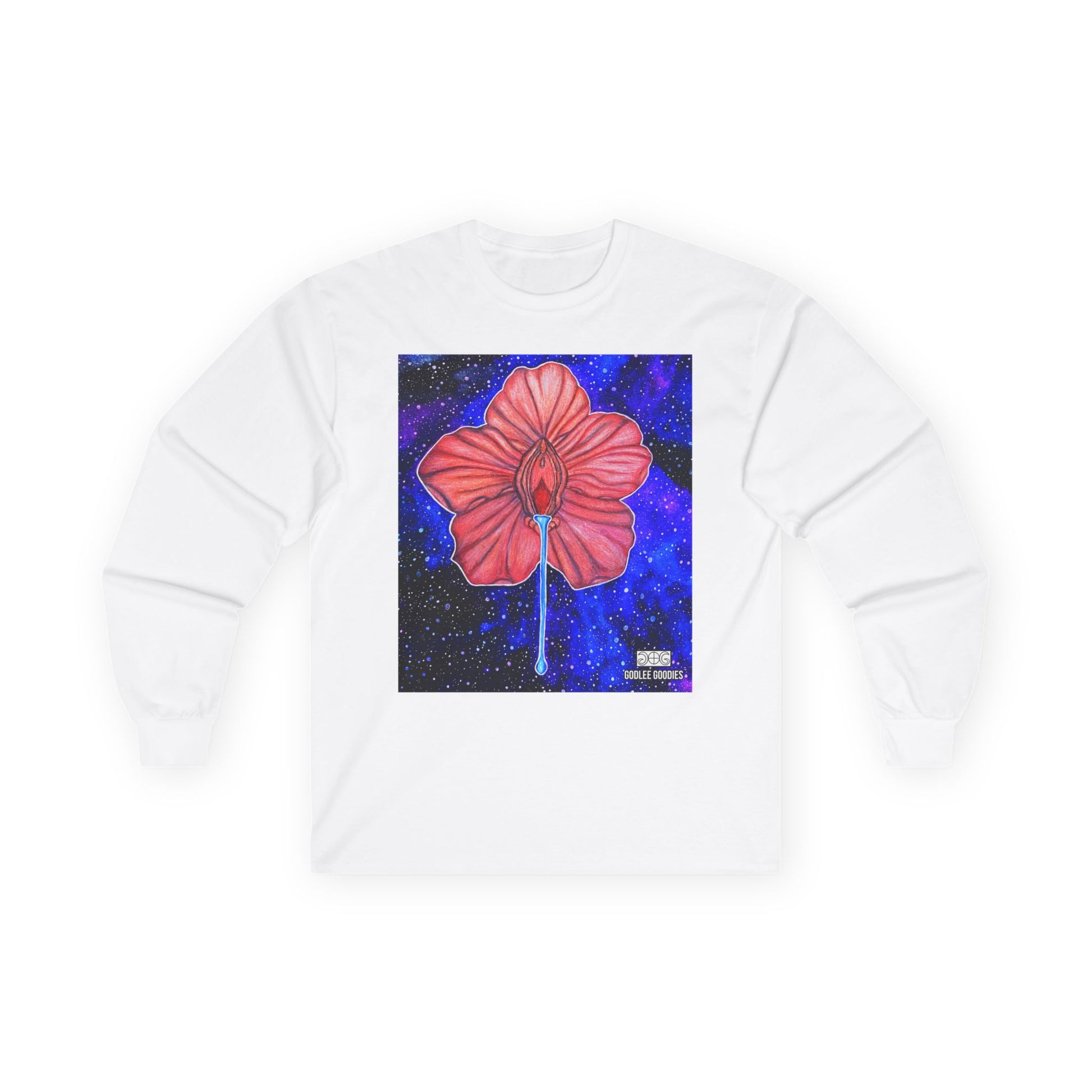 A cosmic and galaxy-themed long sleeve tee featuring a unique design of flower power with an erotic flower. This tee exudes a retro vibe and is perfect for those who love cosmic and artistic elements in their wardrobe. Ideal for adults looking to stand out during festivals, music events, or casual gatherings.